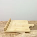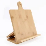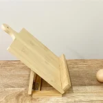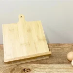 A natural bamboo wood holder is supported by two hinged brackets forming an A frame rest. The smooth solid surface rests at 45 degrees with a small lip to rest the book upon. Smooth clean lines and it simple quality allows this to be compliment any kitchen design. The book area is 21cm wide, 23.5 cm high. The resting lip is 2cm deep. Overall measurements: D5 x H26 x W21cm SKU: KG1056