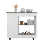 Petal Kitchen Cart, sometimes we need more storage in our kitchens, but we don’t know the exact space for that and its necessary mobility, with the Petal kitchen cart and its caster wheels, you can move it according to your necessities. Whit a contemporary style and a great storage capacity, you can organize all your utensils and containers; it is a perfect countertop used as an auxiliary table. Includes two large shelves (11,3” H x 11,9” H X 22,8” W X 15.7” D) and three side shelves (35,2” H X 10,2” H each one, 13,7”W). Designed with an elegant white-dark brown manufactured wood finish.